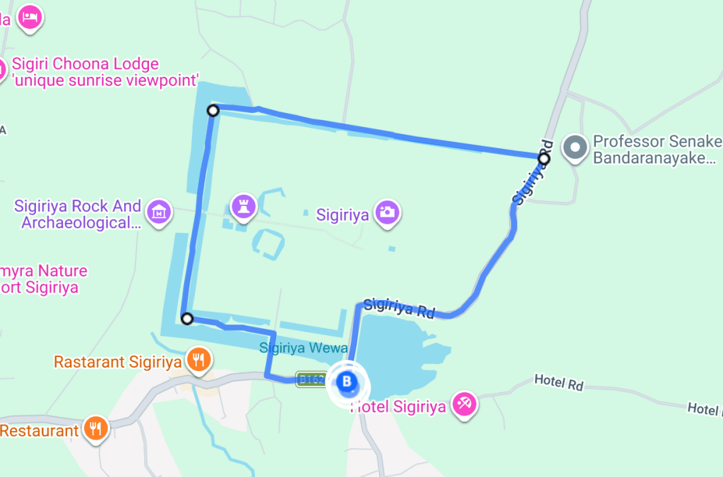This 5km loop circles Lion’s Rock in Sigiriya, Sri Lanka, following the road that runs around the base of the famous rock fortress. The route stays relatively flat and offers views of the surrounding jungle landscape and the towering rock formation throughout the run.